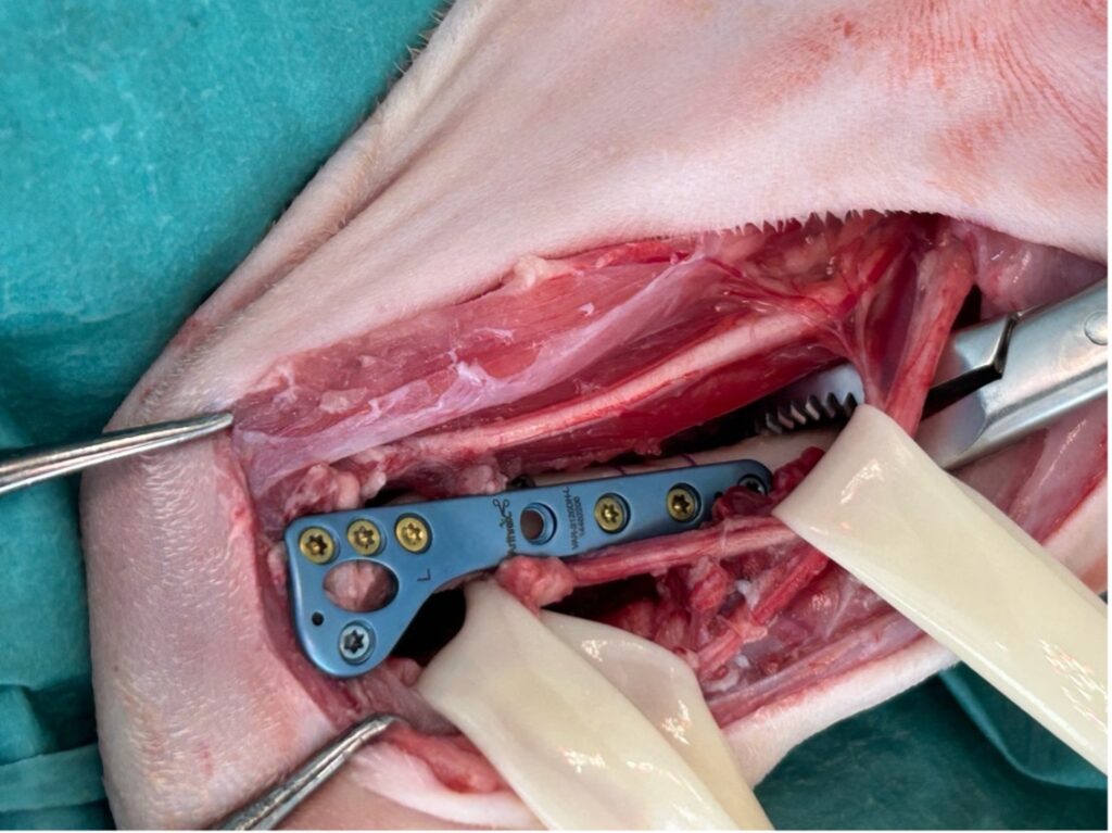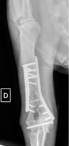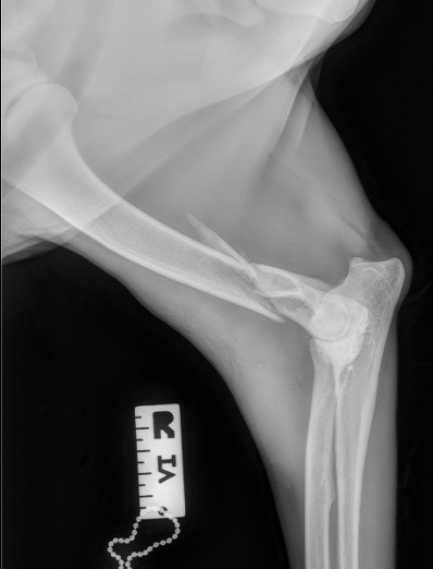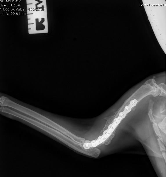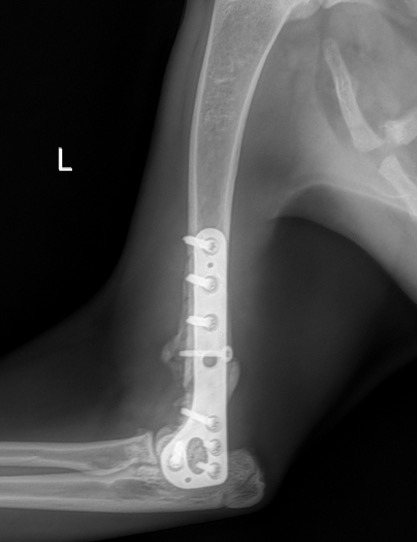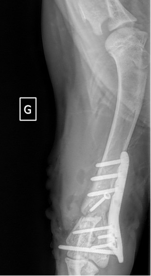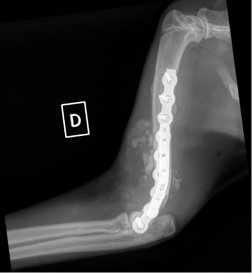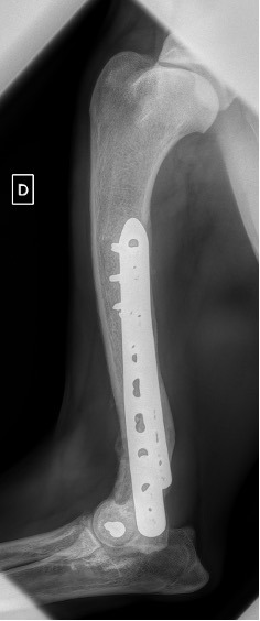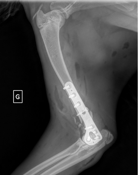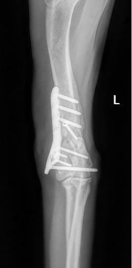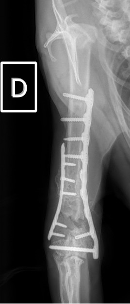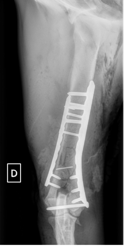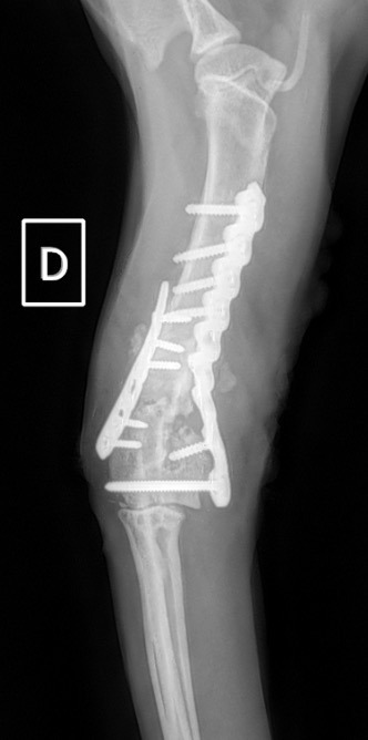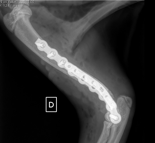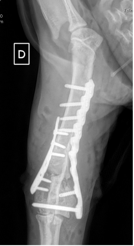 L’avènement récent des plaques anatomiques constitue une nouvelle option dans le traitement de ces fractures : dans l’exemple 3 (chat Ragdoll), une plaque anatomique médiale de 2 mm acceptant des vis de 1,6 et 2 mm a été utilisée seule avec succès.