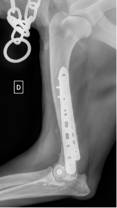 Notre préférence va vers le placement de deux plaques humérales : une médiale de la plus grande taille possible et l’autre latérale, généralement d’une taille inférieure à la première. Dans l’exemple 1 (chat européen), une plaque de 2 mm est utilisée médialement et une plaque de 1,5 mm latéralement. Dans l’exemple 2 (chien Malinois), une plaque de 3,5 mm est utilisée médialement et une plaque de 2,7 mm latéralement.