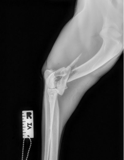 L’humérus distal est composé d’un condyle, de deux épicondyles (médiale et latérale) encadrant le foramen supratrochléaire (fermé chez le chat, présent mais occlus par une membrane chez le chien) et se poursuivant par le fût huméral proximalement.