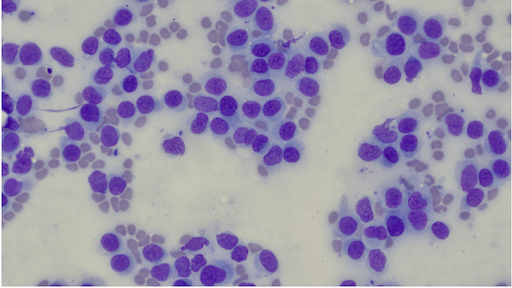 Lors de lymphome cutané, on observe le plus soiuvent une population de cellules lymphoïdes blastiques caractérisées par un cytoplasme peu abondant, basophile et granulaire et par un noyau rond à ovale contenant une chromatine finement granulaire ou finement réticulée contenant un à plusieurs nucléoles.