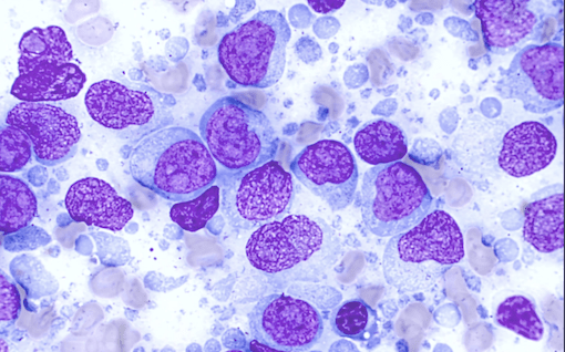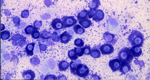 Les plasmocytes présentent un rapport nucléocytoplasmique modéré à élevé ainsi qu’une anisocytose et une anisocaryose modérées. Ils sont caractérisé par un cytoplasme est peu à modérément abondant, basophile et contient généralement une zone préi-nucléaire plus claire (archoplasmique). Leur noyau est rond à ovale, excentré, et contient une chromatine réticulée à légèrment mottée avec un ou deux petits nucléoles ronds peu visibles.